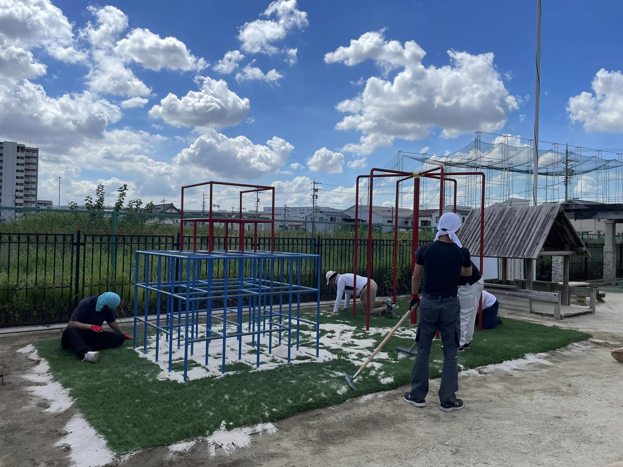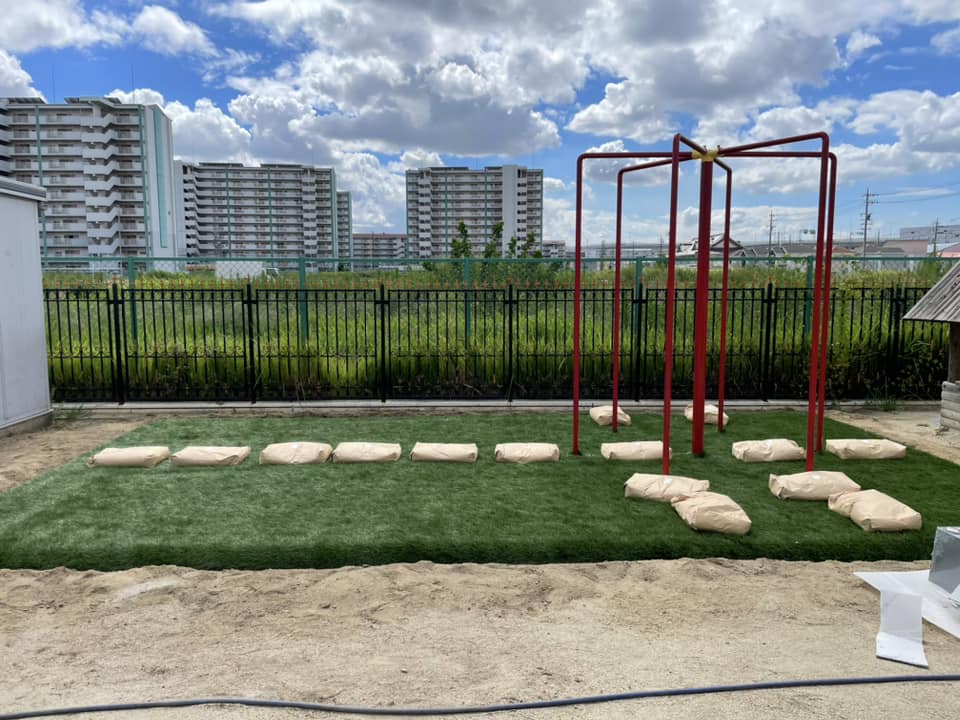 「遊具の下にある、安全対策を重視した弛緩剤」 名古屋市西区のうきの風の子保育園にて、ハイブリットターフPGの施工工事を行いました。 既に鉄棒・雲梯下には施工しておりますが、今回はジャングルジム・登棒の下への施工です。 最初は雑草で散乱していましたが、あっという間にキレイな緑色の空間に変わりました! 足元もフカフカで、子供たちも嬉しそうに遊ぶ姿が見えますね。